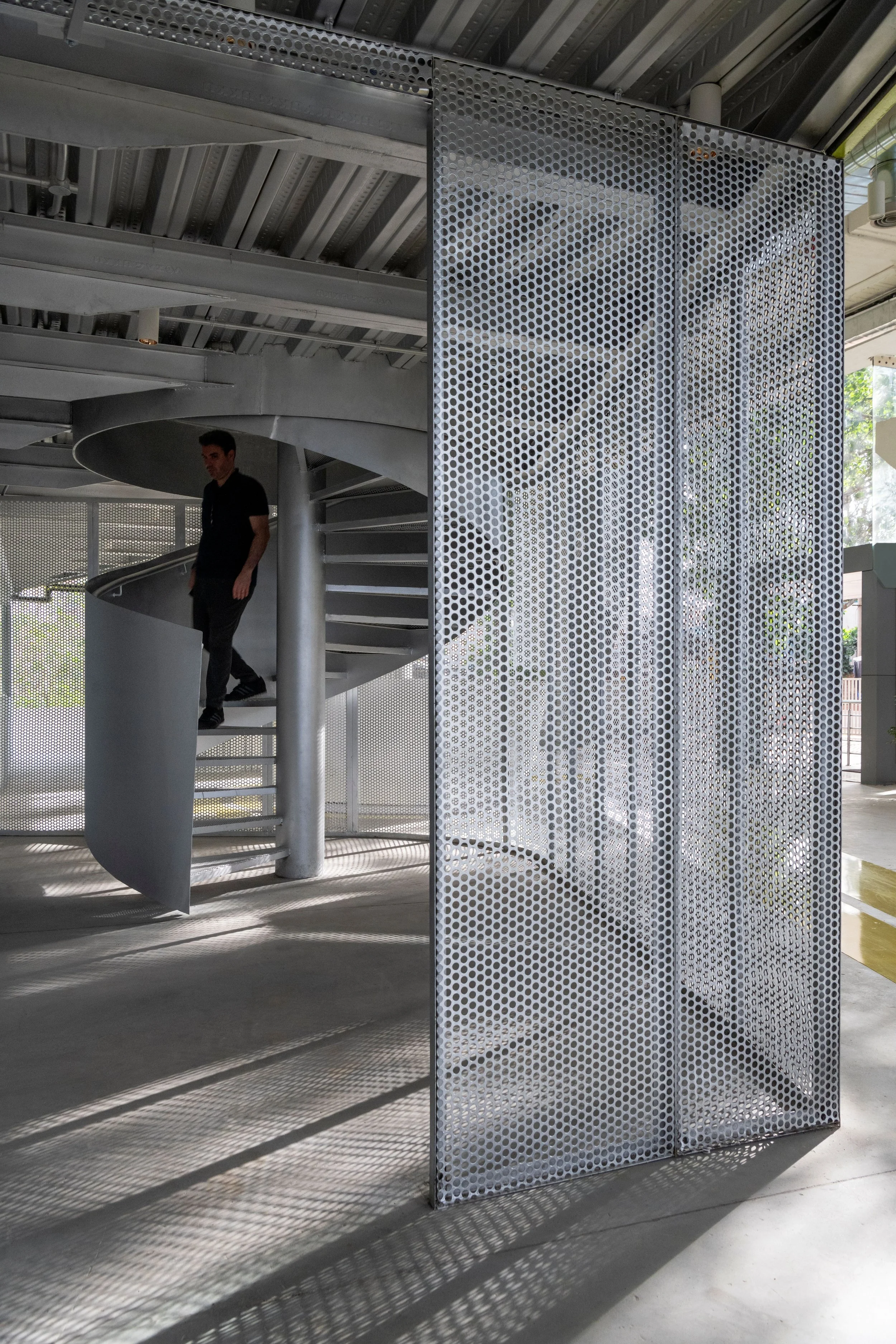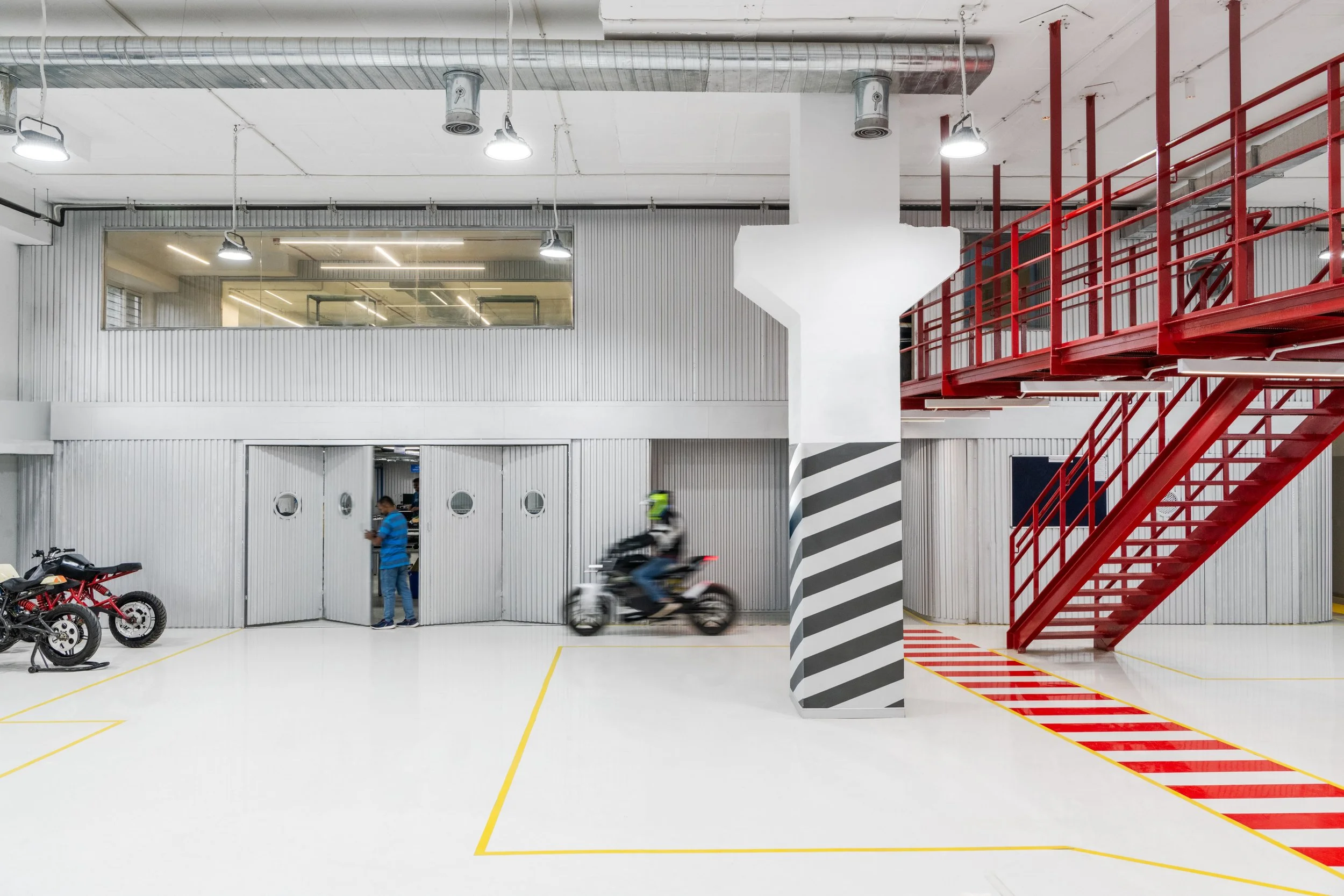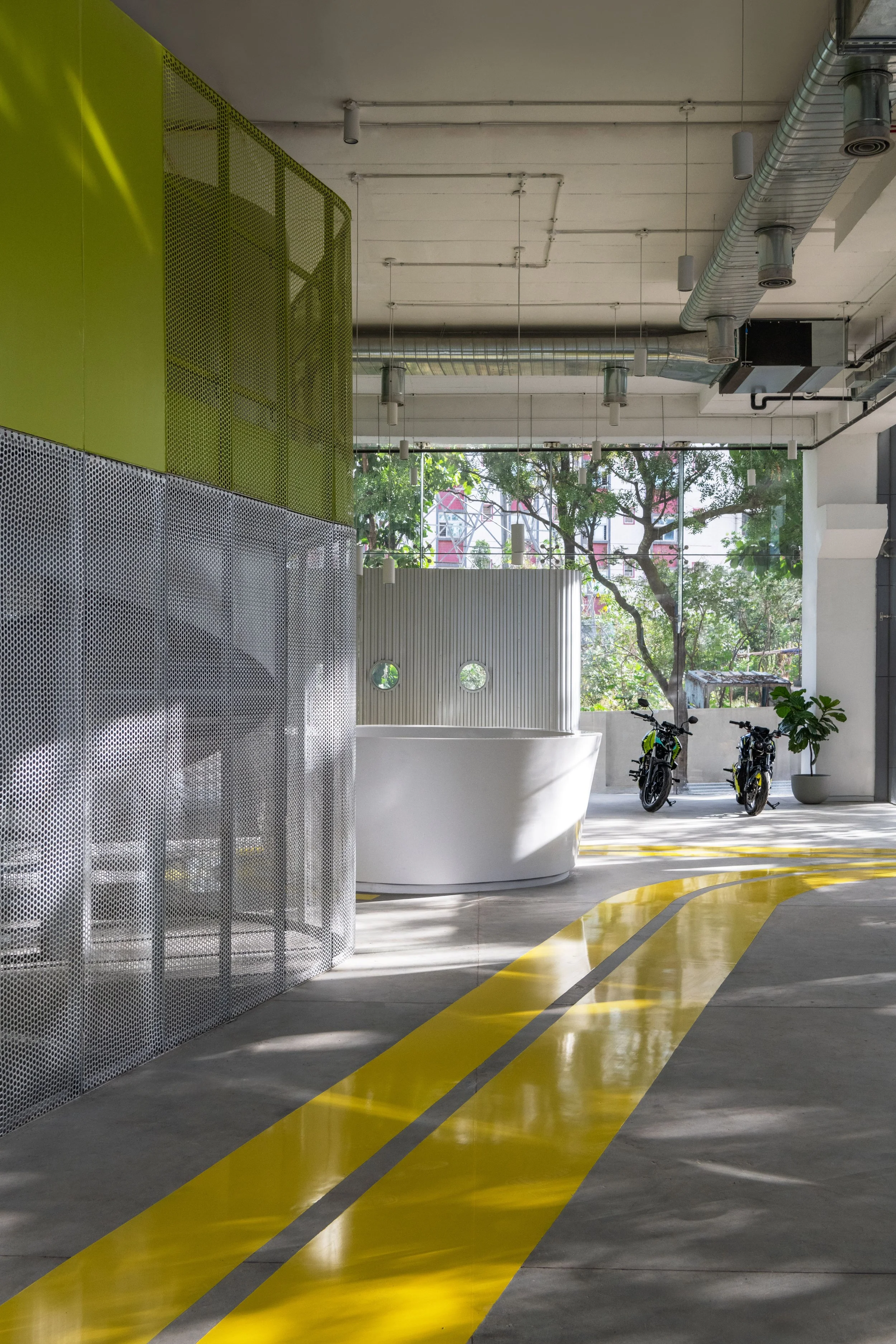 The interior architecture is structured around few but bold formal gestures, minimal and sculptural, using a restrained and industrial palette. A ‘façade’ made of panels of perforated steel in silver and lime green sweep across the entrance lobby announcing the arrival into Orxa HQ. Lime green stripes on the polished cement floor travel through the lobby and towards the production area, a direct reference to the startup’s core habitat, roadways, with superbikes gliding through the lobby and through to the testing track.