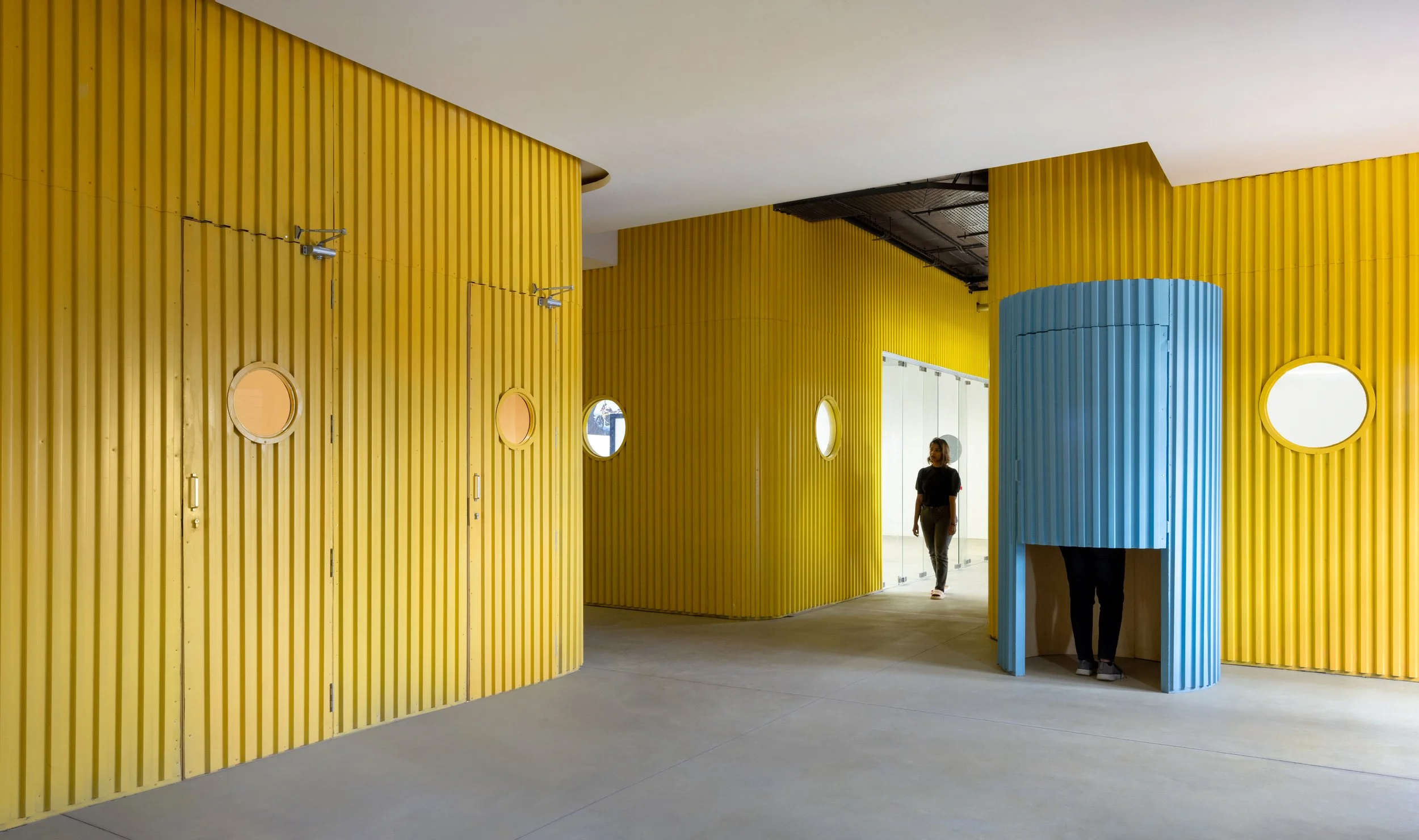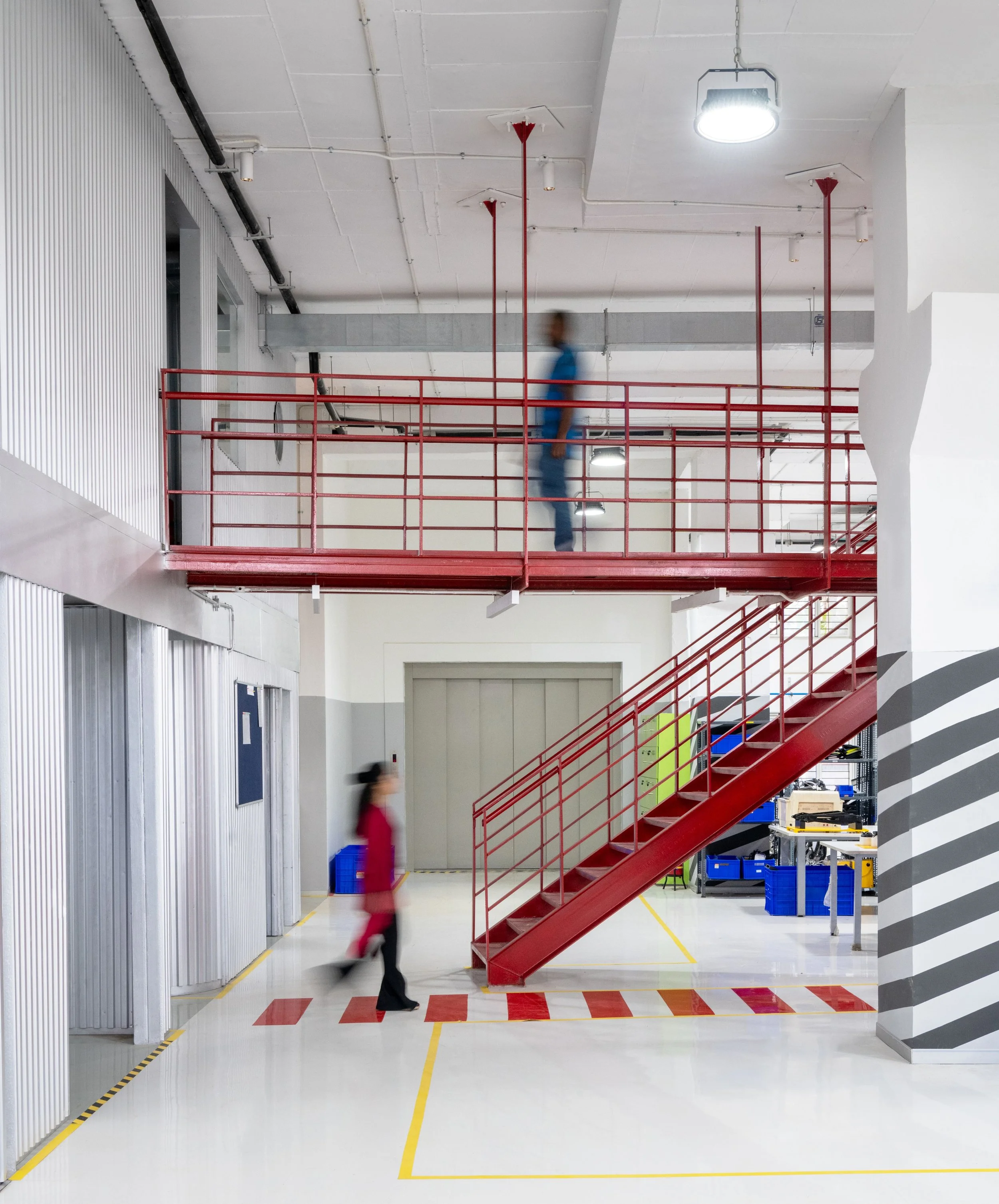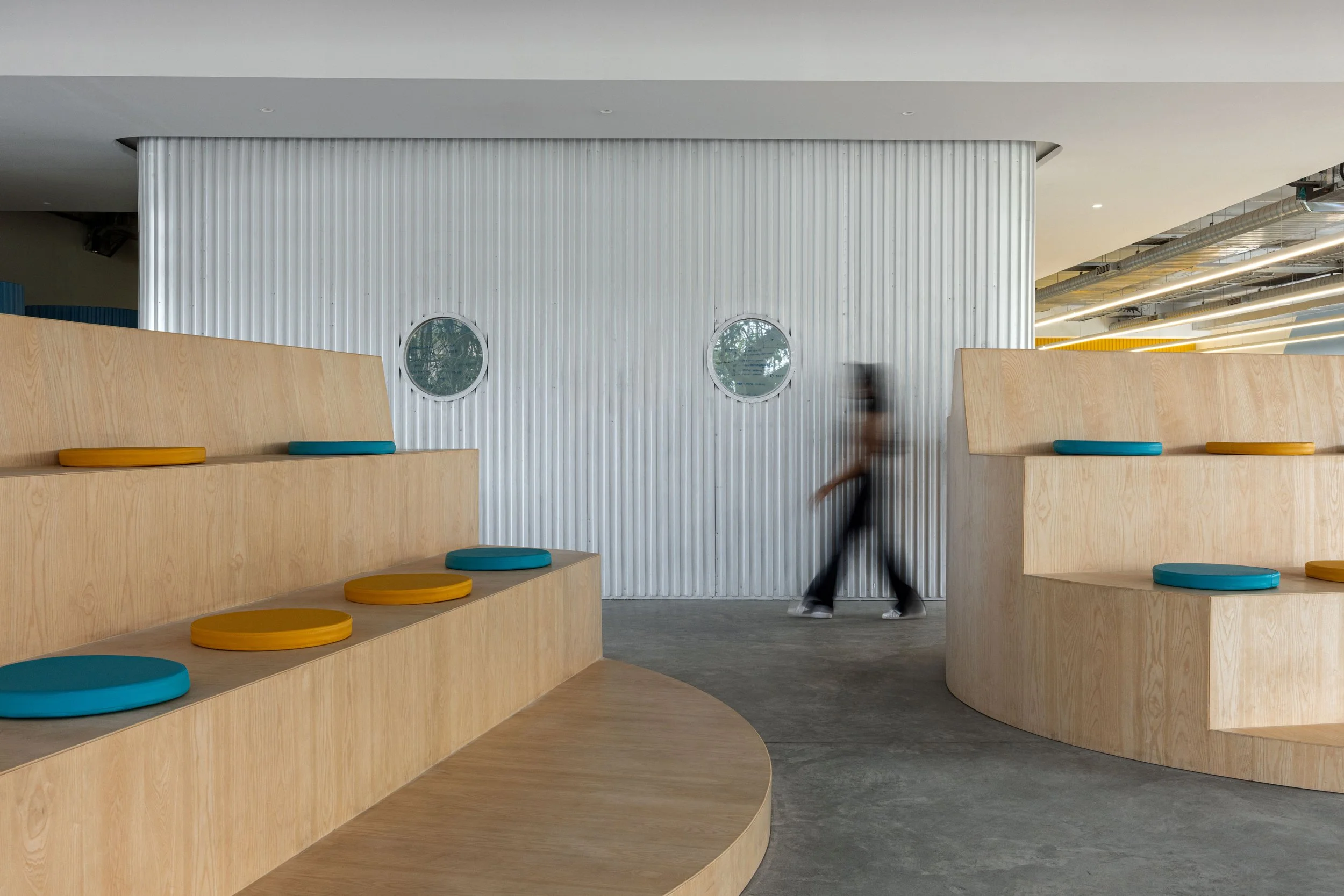 Set across three floors the spaces are designed for a young workforce composed of mechanical and automobile engineers, designers, scientists and production workers. The intent was to encourage collaboration between the various teams: Manufacturing, Research, Creative by prioritizing multi-functional common areas with differing densities, characteristics and amenities. Freestanding meeting pods provide more private discussion spaces while Individual phone/zoom pods scattered around the workspace add another layer of communication spaces. On the first floor a series of circular stepped forms create the “Forum”, a playful cluster that can be used for townhalls, screenings, briefings or as casual meeting areas.